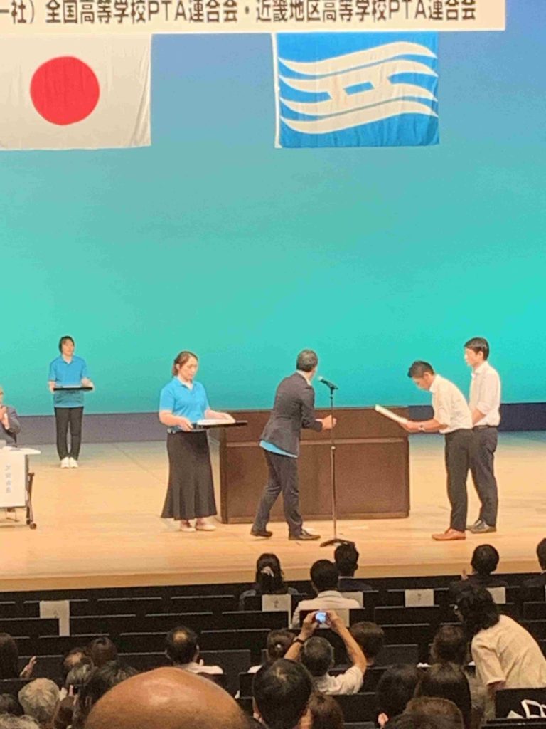開会式では、広報紙コンクール表彰式において、県立河瀬中学校・高等学校PTAが近畿地区高P連会長賞を受賞され、代表2名が表彰されました。また、R5・R6と当連合会会長を務めてくださった前川久幸様、7年間事務局長を務められた川嶋典明様が感謝状をいただかれました。